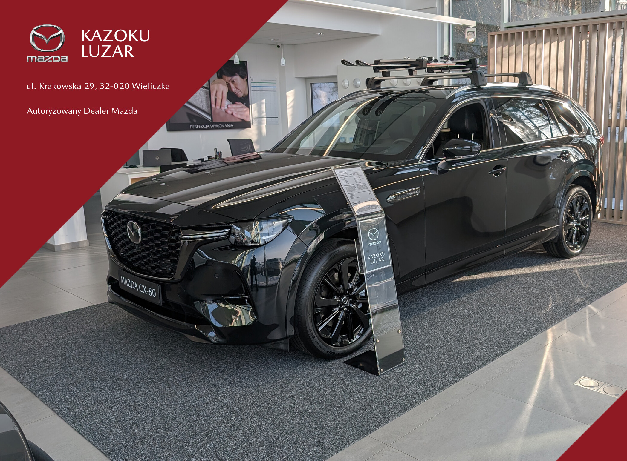 Autoryzowany Dealer Mazdy - Kazoku Luzar Sp. z o.o. Wieliczka, ul. Krakowska 29 ma do zaoferowania pojazd MAZDA CX-80 o mocy 254KM z automatyczną skrzynią biegów i napędem 4x4 w wersji HOMURA PLUS w kolorze JET BLACK. Pojazd fabrycznie nowy, dostępny od ręki. Objęty 6 letnią gwarancją producenta (lub 150 000 KM).